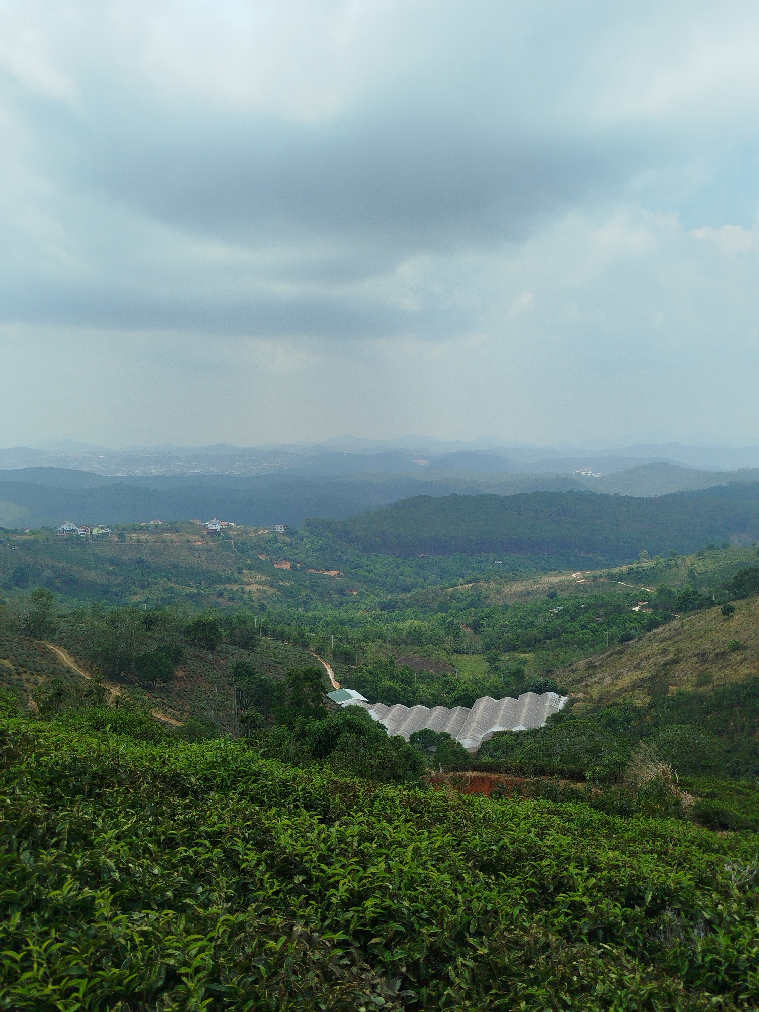 The image depicts a landscape in Trường Thọ, Vietnam, featuring layered hills and valleys under an overcast sky. In the foreground is a dense, green tea plantation. Further down the slope, a large, white-roofed greenhouse complex is nestled in the valley. Beyond the valley, the landscape transitions to a series of forested hills, gradually fading into distant mountains and what appears to be a city skyline. Several houses are visible on the nearer hills. A winding dirt road cuts through the landscape.