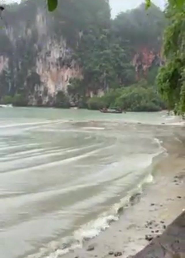The scene depicts a beach on a rainy day. The water is shallow with visible wave patterns in the sand. There are lush green trees and a large rock formation in the background. A boat is docked in the distance. The beach is deserted.