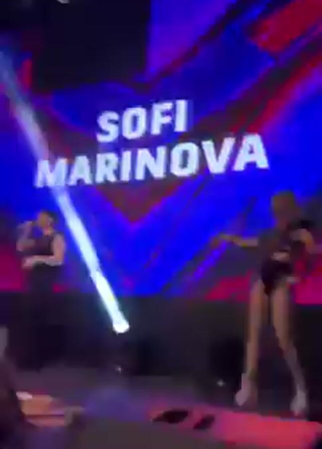 performance at a club. The stage has a large screen in the background that says “Sofi Marinova”. In front of the screen, a dancer in a black bodysuit is performing, and a singer in a black dress is on stage left. The audience is densely packed, and the club’s lighting system is visible overhead, displaying red and blue lights. The view is shaky, suggesting the camera is hand-held.