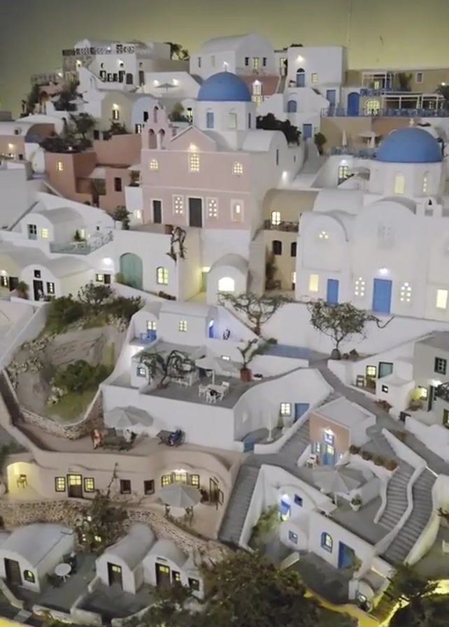 - "The video presents a detailed miniature model of a Greek village, likely Oia in Santorini, famous for its whitewashed houses and blue-domed churches" by FM-p7YQZ2, licensed under CC BY 4.0