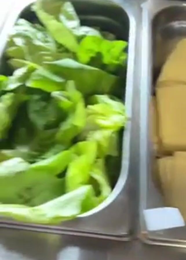 variety of ingredients, likely for making sandwiches or burgers. There are several stainless steel containers with different items: sliced cheese, lettuce, sliced red onions, sliced tomatoes, pickles, and a creamy orange sauce. The setup suggests a food preparation area in a restaurant or similar establishment.