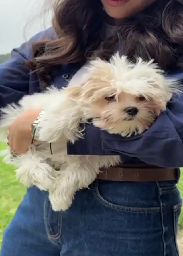 A woman is holding a small, fluffy, light-colored dog in her arms