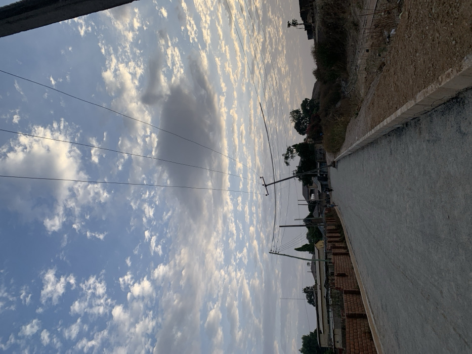 A quiet paved road extends into the distance, flanked by a low brick wall on one side and a grassy, elevated verge on the other. Overhead, a bright sky is filled with scattered clouds. Telephone poles line the road, with power lines running across the sky. Beyond the road, houses and trees are visible. The view is slightly tilted, giving a sense of leaning or asymmetry.