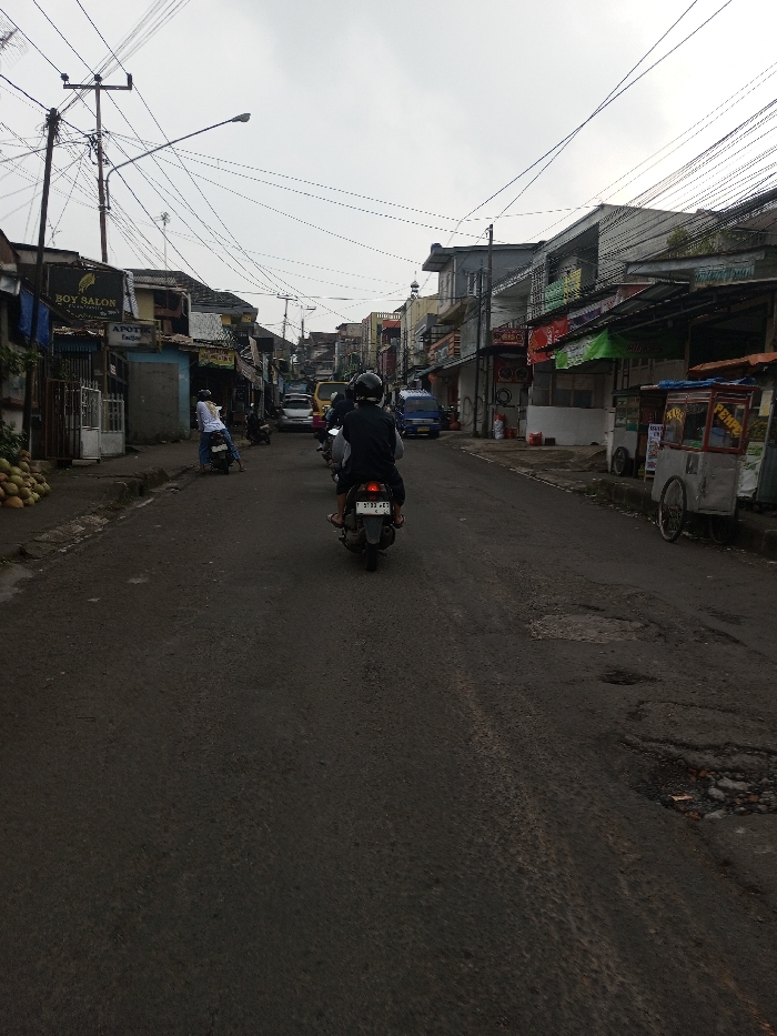 This image depicts a street scene in the city of Sandamal Eliya, Sri Lanka, characterized by a mix of commercial and residential structures under an overcast sky. The asphalt road, exhibiting visible cracks and potholes, extends from the foreground into the distance, flanked by buildings on both sides. In the immediate foreground, a dark-colored scooter is centrally positioned, moving away from the viewer. A single individual, wearing a dark long-sleeved shirt and a black helmet, operates the scooter. Its license plate, partially obscured, displays "D 5733 WE". On the left side of the road, a wide sidewalk features a large pile of green coconuts. Further along this sidewalk, a light-colored scooter is parked, with an individual in a white shirt and light pants seated sideways on it. Buildings on the left include a business with a prominent "BOY SALON" sign and an "APOTIK" sign below it, indicating a pharmacy. Numerous utility poles support a dense network of overhead electrical and communication wires that crisscross the sky. On the right side of the street, another sidewalk runs parallel to the road. A light-colored mobile vendor cart, inscribed with "PEMPPE," is parked on this sidewalk. The buildings on the right are multi-story, featuring various shopfronts with colorful signage. In the mid-distance, a blue van is visible, and further back, the top of a structure resembling a mosque dome or minaret is faintly discernible. Additional vehicles, including a yellow van and multiple scooters, are observed further down the street, indicating active traffic and parked vehicles. The overall scene suggests a bustling urban environment.