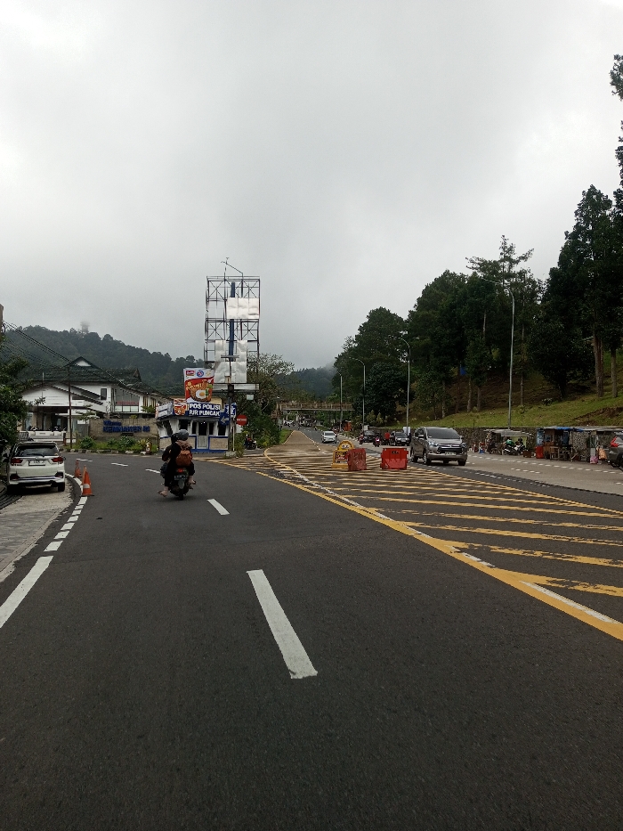 The image depicts a street scene set in a hilly, possibly mountainous, region of Saing Ta Mawt Lay, Myanmar, under an overcast sky. A paved two-lane asphalt road dominates the foreground and midground, marked with white dashed lane lines and diagonal yellow stripes indicating a merge or turning area. A black motorcycle, carrying two individuals (a driver in dark attire and helmet, and a passenger with a backpack), travels away from the viewer in the left lane. To the left of the road, a light blue and white building is identified by signage as a "POS POLISI TUR PUNCAK" (Police Post Puncak). Above this structure, a tall, multi-tiered metal framework, possibly a billboard support or communication tower, rises against the sky. Further back on the left, a white sedan is parked on the shoulder near an orange traffic cone, and other buildings are visible nestled into the hillside. To the right of the road, dense green trees and foliage cover an upward sloping terrain. A silver SUV is visible in traffic, facing the camera, further down the road on the right, where a line of small vendor stalls and parked motorcycles also extends along the roadside. Red and yellow traffic barriers are placed on the road near the yellow diagonal markings. A pedestrian bridge spans the road in the mid-distance. Traffic appears present in both directions, indicating an active thoroughfare.