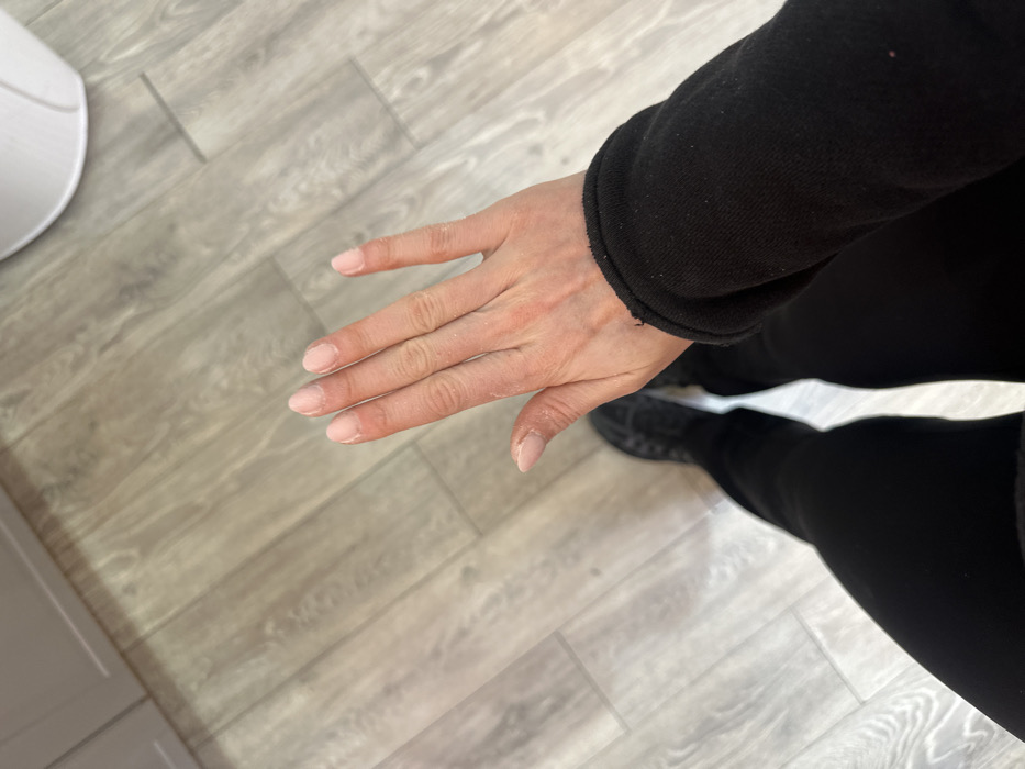 A close-up, downward-angle image depicts a person's left hand extended over a light wood-effect floor. The hand exhibits fingernails coated in a light pink or nude polish, with visible remnants of powder or dry skin around the cuticles and nail beds. The person is wearing black long-sleeved clothing, visible at the wrist, and black trousers or leggings leading down to black athletic shoes, partially visible at the bottom of the frame. The immediate environment is an indoor setting with light-colored, plank-style flooring. In the upper left background, a light grey cabinet or furniture item is partially visible. In the upper right, a portion of a white, curved object, possibly a piece of salon equipment or a container, is present. The precise location within Tunbridge Wells, United Kingdom, is not discernible from the visual information provided.