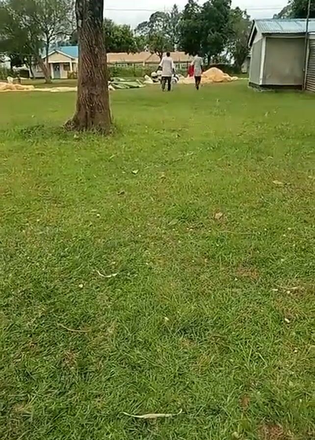 n outdoor scene with a grassy field in the foreground. A large tree stands to the left of the frame. In the background, there are several buildings, including a gray one on the right and others with blue roofs further back. Two people are walking away from the camera across the field toward the buildings in the background. There appear to be piles of materials or debris spread on the ground in front of the buildings. The sky is overcast.
