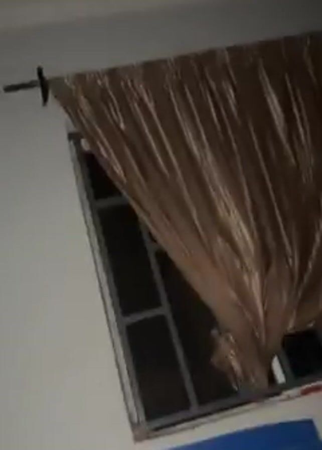 The camera is pointed up towards a white ceiling. Below the ceiling, partially visible in the frame, is a set of closed gold-colored curtains. The camera appears to be handheld and moving slightly.