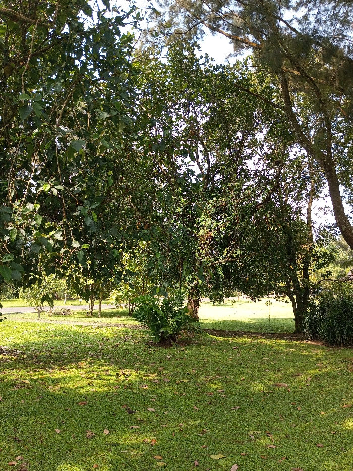 The scene depicts a verdant outdoor landscape in New Serchhip, India, under natural sunlight. The foreground features a expanse of manicured green grass with scattered dried leaves, displaying areas of dappled shade. Several large trees with dense green foliage dominate the midground and background. A tree on the immediate left exhibits hanging branches and leaves. A central tree trunk is visible, with a cluster of fern-like plants growing at its base. In the distant background, a brightly lit open grassy area is visible, alongside what appears to be a paved surface or road on the far left. The sky is partially visible through the tree canopies, appearing clear. No individuals, animals, or specific man-made objects beyond the potential paved surface are present within the immediate view.
