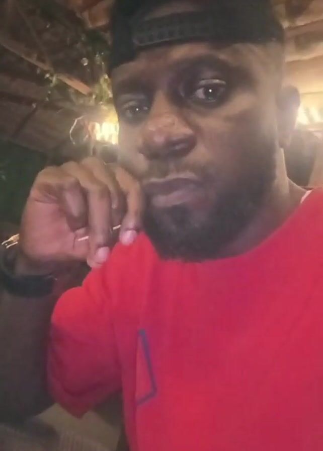 close-up selfie of a Black man with a dark beard and mustache. He's wearing a red t-shirt and a black baseball cap with white lettering. His left hand is raised, with fingers resting on his cheek. The background is blurry but suggests an outdoor or semi-outdoor setting, possibly a patio or gazebo with a wooden structure and lights. In the background, blurred figures of other people are visible.
