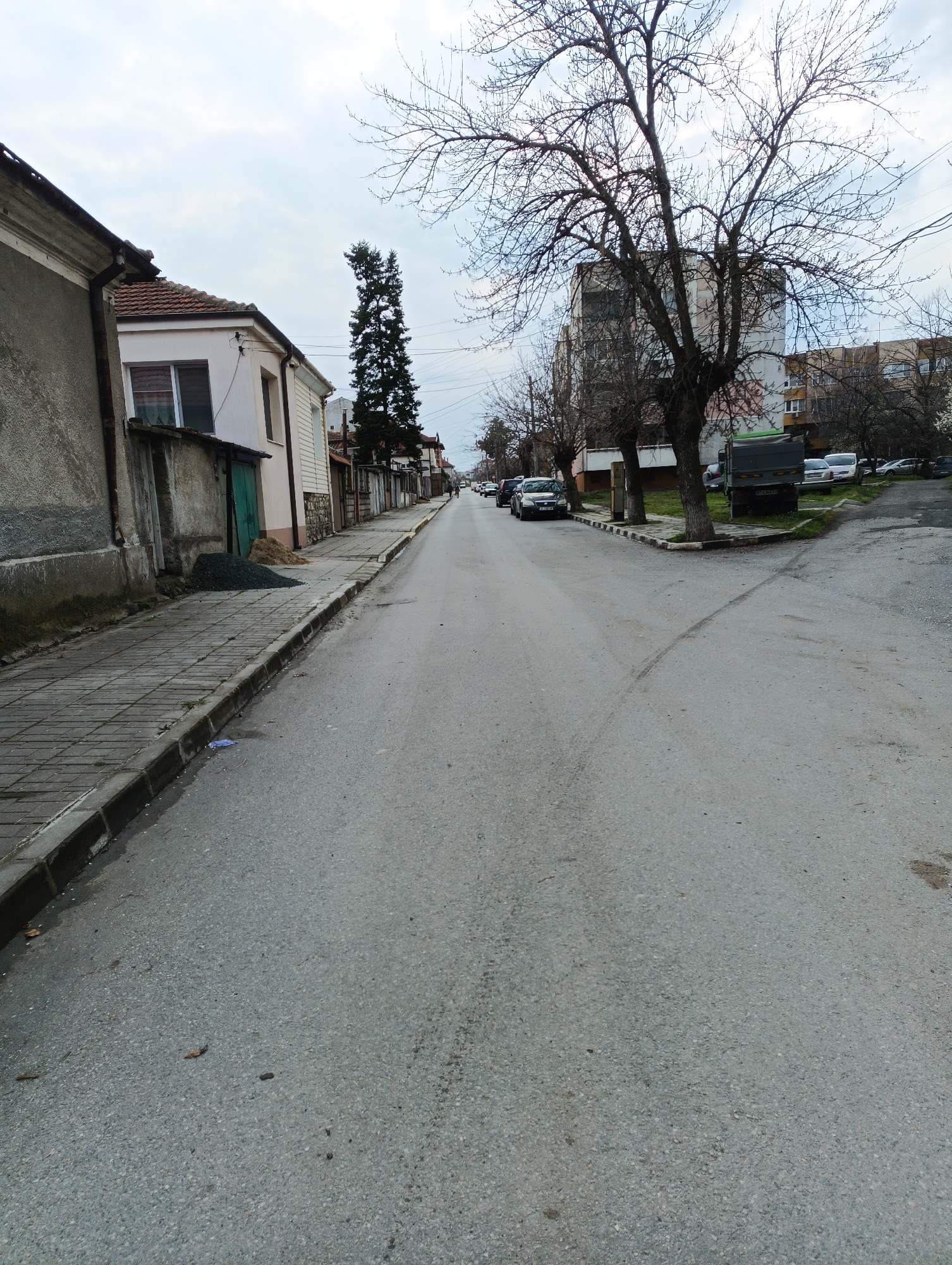 street in Karnobat, Bulgaria. The road extends into the distance with cars parked on either side. Buildings line the left side of the street, and trees are on the right, some appearing bare. A pile of gravel is visible near a building on the left. The sky is overcast.