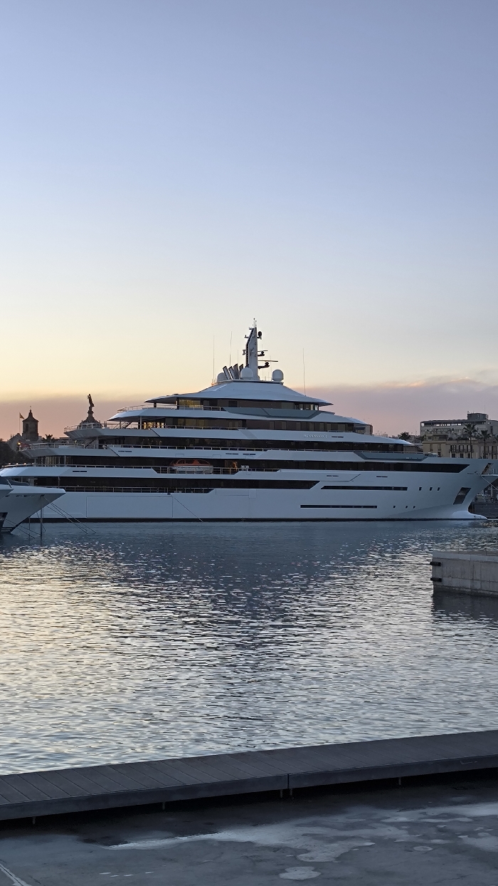 - "A large, white yacht dominates the frame, docked in calm water reflecting the sky's gradient from light blue to peach at dusk" by FM-WId4x1, licensed under CC BY 4.0