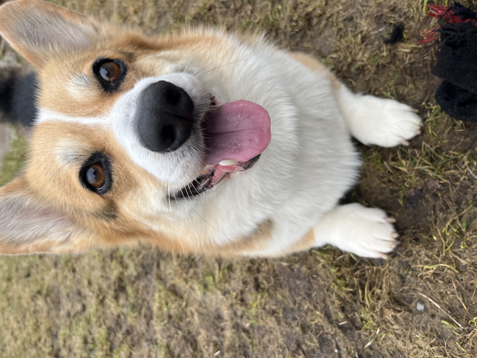 - "A Pembroke Welsh Corgi, exhibiting a red-and-white coat pattern with dark brown eyes and a black nose, is depicted sitting on damp earth mixed with sparse, light brown grass" by FM-4GKkh1, licensed under CC BY 4.0