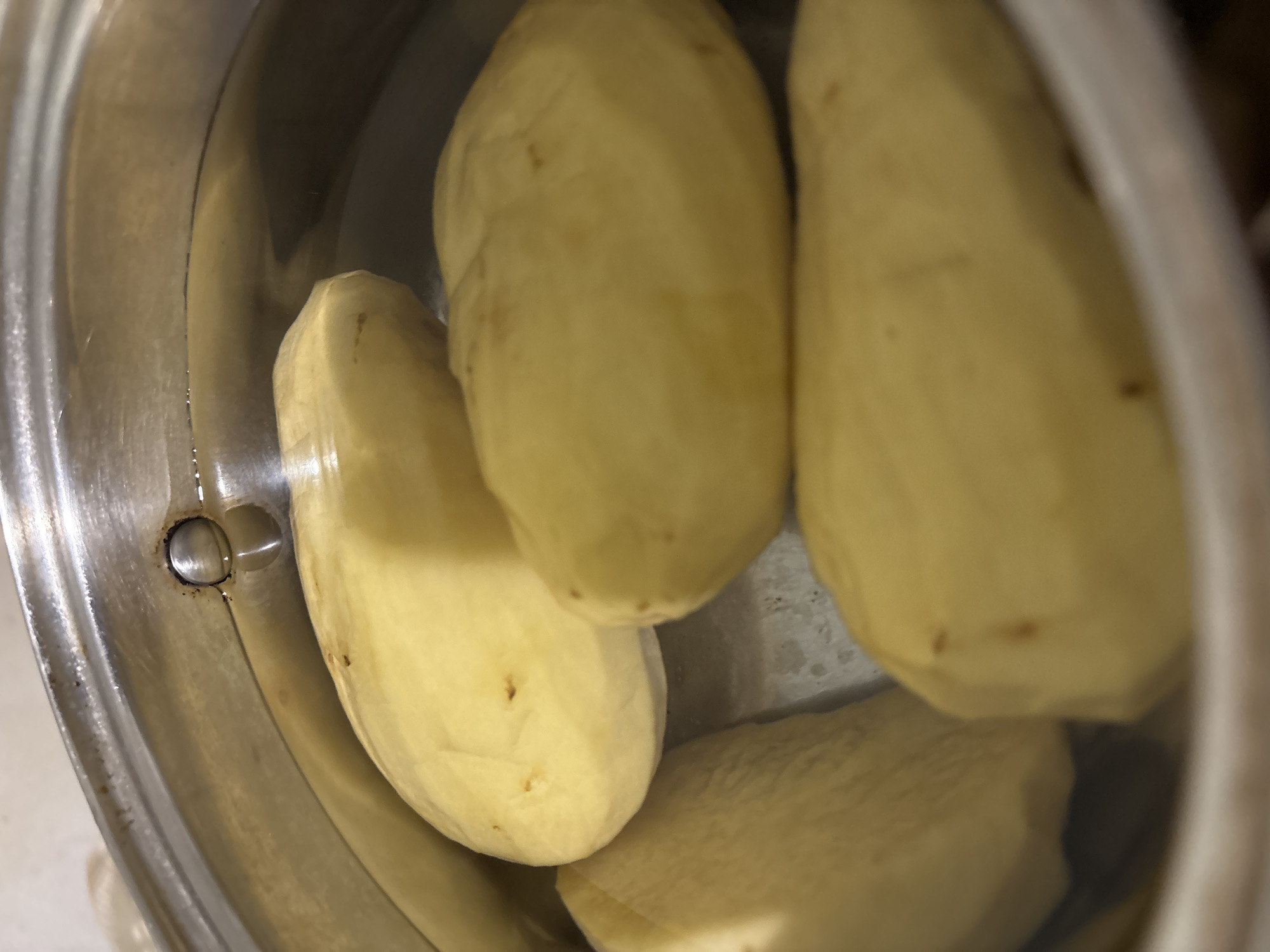 A close-up, slightly blurred, high-angle shot shows four peeled, oblong potatoes submerged in water inside a silver-colored pot
