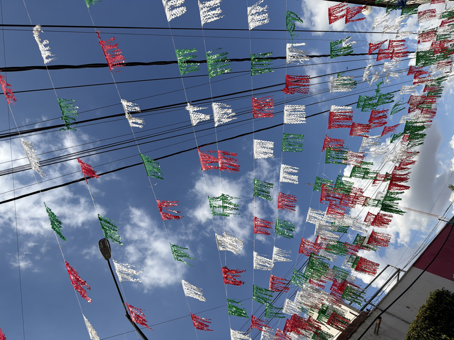Colorful "papel picado" banners, in red, white, and green, hang overhead, creating a festive canopy
