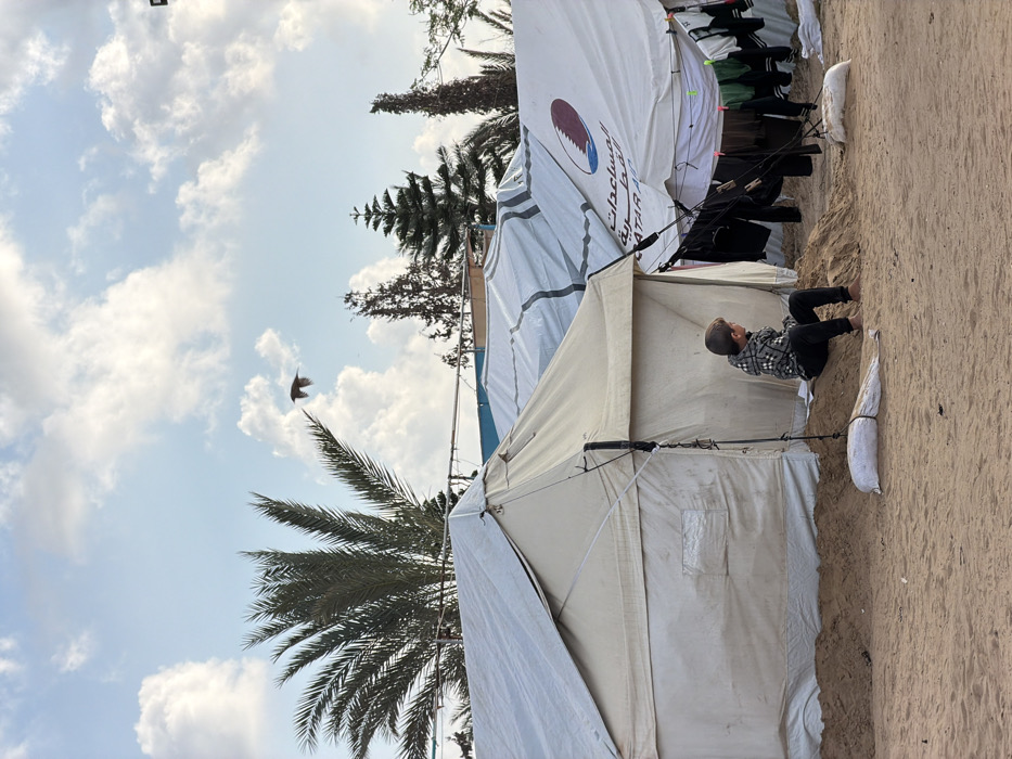 The image captures an outdoor scene in a-Zawayda, Palestinian Territory, featuring a temporary settlement under a partly cloudy sky