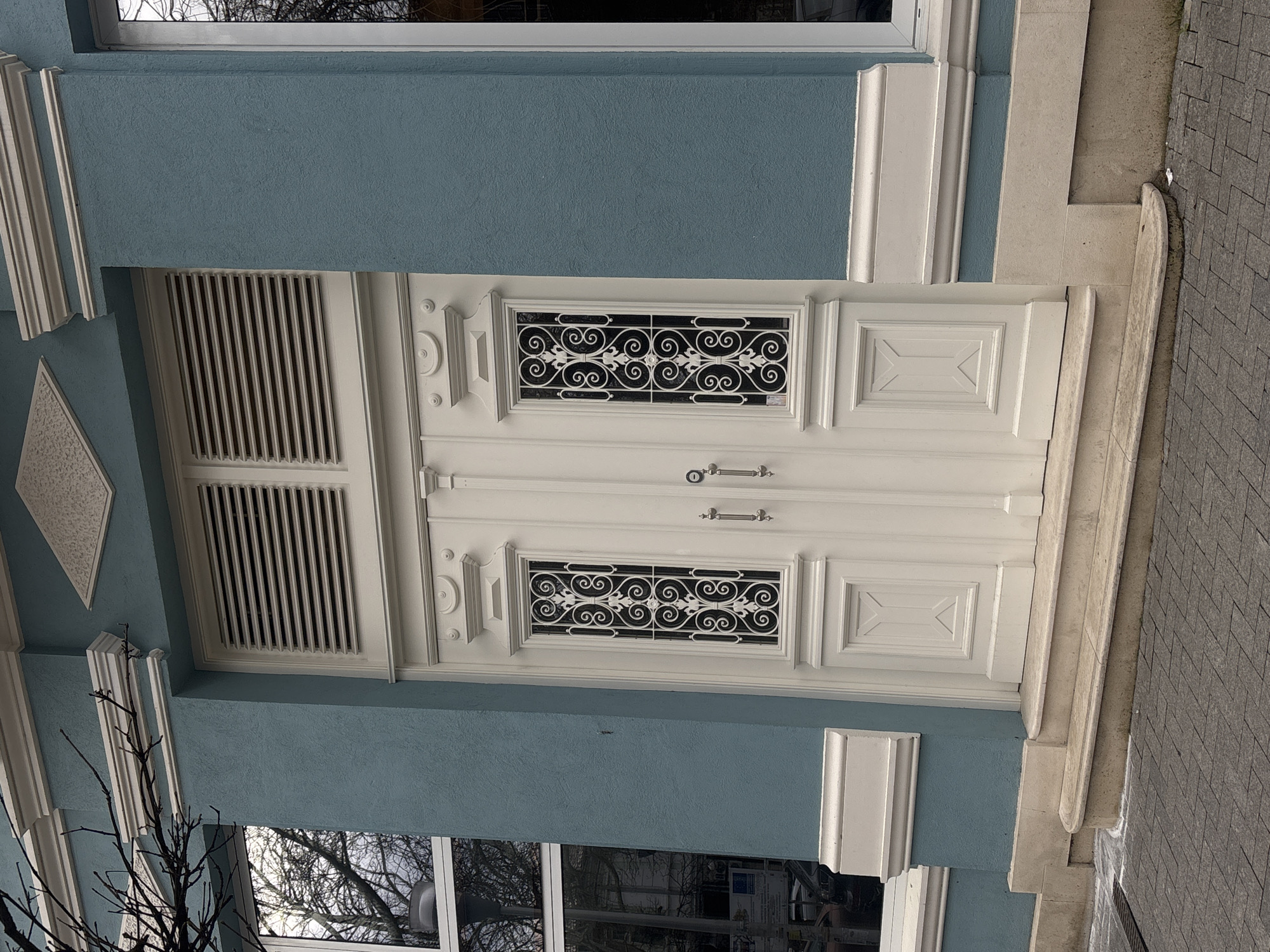 A full frontal view of a set of double doors is presented. The doors are painted white and are ornate, including window panes with elaborate metal scrollwork, raised geometric panels, and decorative moldings. A pair of horizontal metal handles are affixed to the doors. To the left of the door is a vertical slatted structure and a decorative relief. The door is set into an opening framed by a blue-painted wall with white architectural trim. The building exterior is also visible below the door, and it appears to have windows and similar blue and white trim. A stone threshold leads to a paved walkway. The scene is in Varna, Bulgaria.
