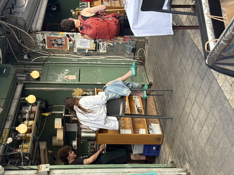 The scene depicts an urban outdoor area fronting a food establishment in Tel Aviv-Yafo, Israel, confirmed by Hebrew text on visible signage and posters. Three individuals are present. On the left, a male with dark, curly hair and a leg tattoo, wearing a black t-shirt and dark green apron, stands behind a wooden counter, performing an unseen task. Adjacent, a second individual with long brown hair, dressed in a white shirt, light blue jeans, and bright green 'PEITIV' branded shoes, sits on a black bar stool, facing away from the viewer. To the right, a third individual, a male with short dark hair, wearing a black tank top, shorts, and a red backpack, stands facing away towards the left. The establishment's dark green facade features shelves displaying glass jars, stacks of plates, and spherical pendant lights. The wall also exhibits graffiti, exposed wiring, and multiple posters, one prominently reading 'TILL HAZE KUHI ALMA'. The ground is paved with rectangular grey tiles, and components of an outdoor dining area, including a white-clothed table, are visible on the far right.