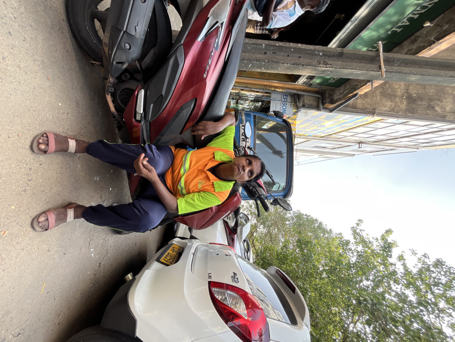 An outdoor, eye-level photograph depicts an urban street scene in Colombo, Sri Lanka, under a clear daylight sky. In the center, a woman of South Asian descent, appearing to be in her late 30s or early 40s, sits astride a maroon-colored scooter. She wears an orange and lime-green short-sleeved collared shirt with two horizontal reflective stripes on the torso, navy blue athletic pants, and brown open-toed sandals. Her dark hair is pulled back. She looks upwards and slightly to her left. Her right forearm rests on her right knee, and her left hand is on the scooter's seat. The maroon scooter, possibly a Honda Dio model, occupies the foreground. Behind it and to the left, a blue three-wheeled auto-rickshaw (tuk-tuk) is partially visible. To the right of the woman and scooter, a white Maruti Suzuki Alto LXi hatchback is parked, showing its rear with license plate "CAF 0859". Another white vehicle is partially visible to the right of the Alto. A white scooter is partially visible behind the maroon one. On the left side of the frame, a grey concrete utility pole stands. Behind it, commercial buildings line the street. A shop sign partially displays "ANMAL" (likely part of "ANIMAL TRADE") and another sign shows the "EPSON" logo. A multi-story building with numerous windows extends into the upper left background. Two men are partially visible on the far left, near a shop entrance; one wears a white and blue patterned shirt, the other a striped shirt. The ground is paved concrete or asphalt, showing signs of wear. Green tree foliage is visible in the upper right quadrant of the image, against the bright sky.