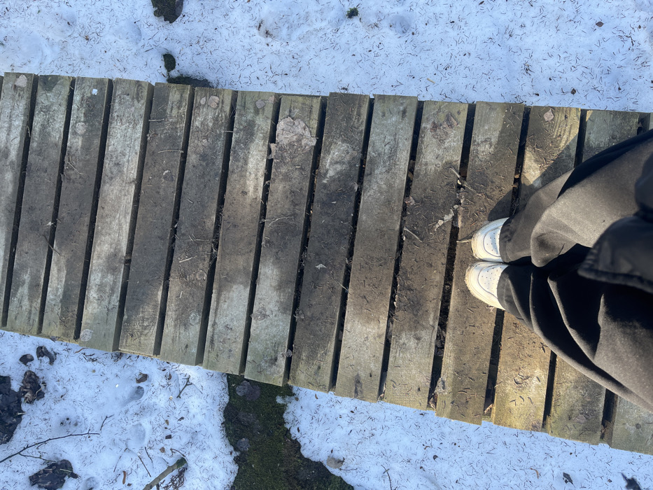 - "The image displays an overhead view of a person's lower legs and feet standing on a wooden boardwalk in Pargolovo, Russia" by FM-Vurnq1, licensed under CC BY 4.0