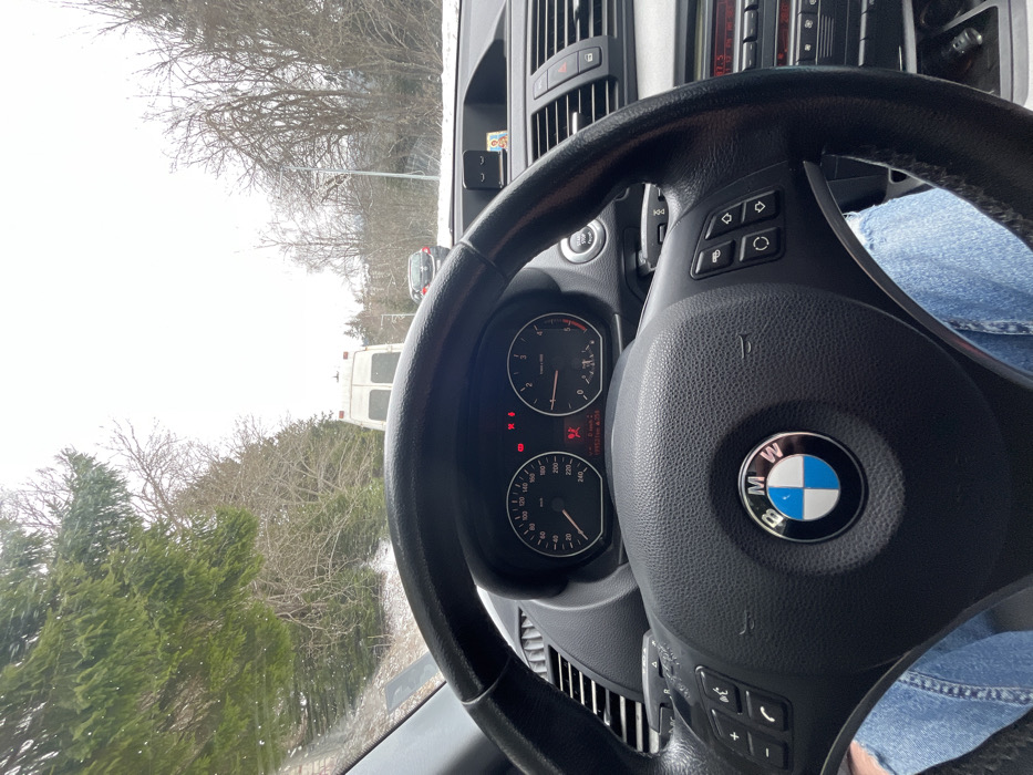 The image captures a first-person perspective from inside a BMW vehicle, depicting a winter road scene in Пампорово, Bulgaria. The driver's legs, clad in blue denim jeans, are visible at the bottom of the frame beneath a black, multi-function BMW steering wheel featuring the brand's emblem. The dashboard's instrument cluster displays a speedometer reading 0 km/h and a tachometer showing 0 RPM. Several red warning lights are illuminated, including battery and seatbelt indicators, and the odometer shows 191531 km. To the right on the dashboard, a black phone holder and a small framed picture are present. Beyond the windshield, the snowy roadside is visible, leading to a paved road ahead. A white cargo van with orange roof lights is positioned directly in front of the BMW, appearing stationary or moving slowly. A dark-colored passenger car is partially visible behind the van. The environment is characterized by bare deciduous trees and green coniferous trees lining both sides of the road, indicative of a mountainous, wintry landscape. The sky is overcast and bright.