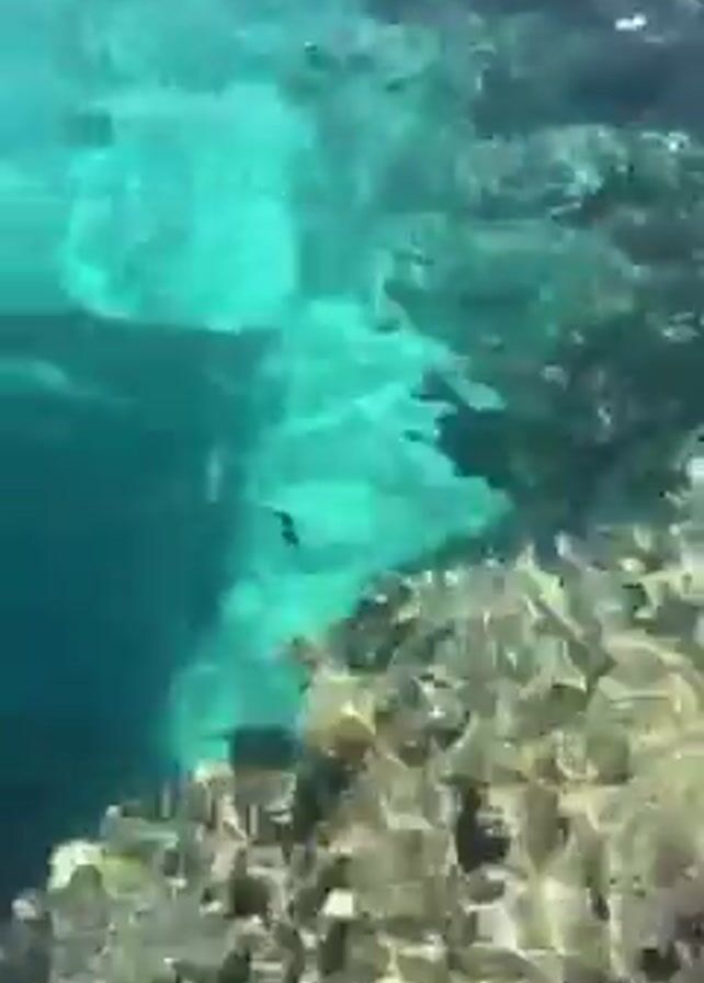 n underwater view of a vibrant, clear, turquoise sea. The camera is positioned above a rocky, coral-filled area, looking down into the water. The sunlight filters through the water, creating an effect on the sandy bottom. The water appears deep and inviting, with a few small fish visible near the rocky edges. The camera seems to be capturing a glimpse into a thriving marine ecosystem.