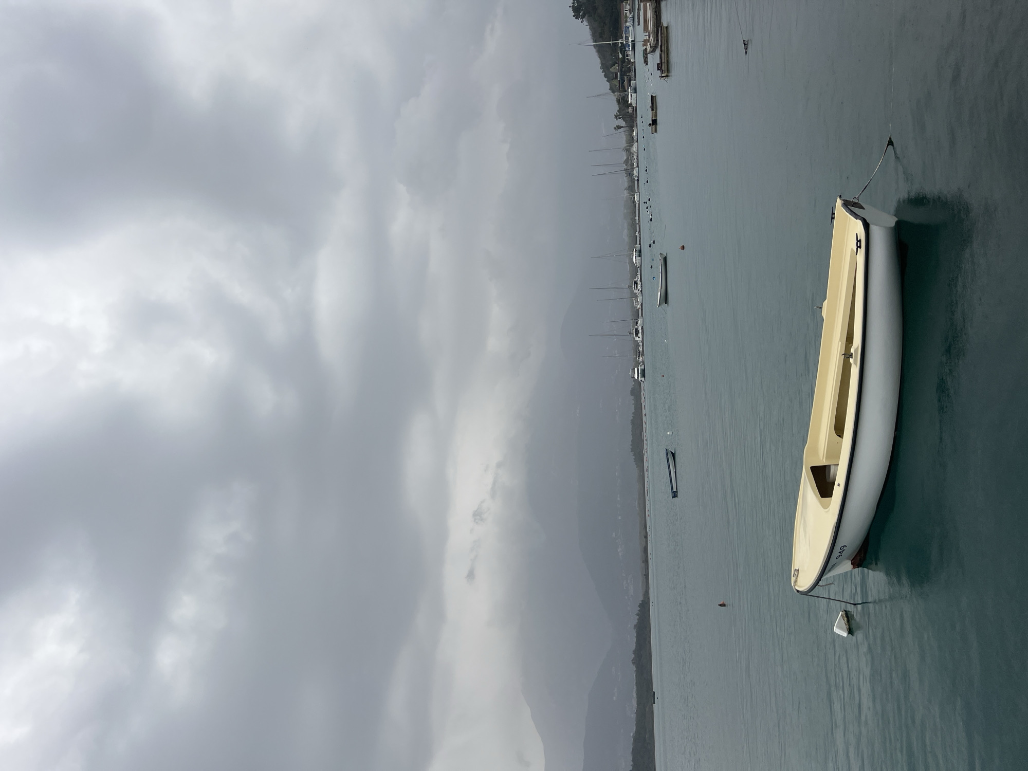 The image captures a maritime scene in Đuraševići, Montenegro. The foreground is dominated by a white skiff with a cream-colored interior, bearing the number "949" on its bow, moored in calm, blue-green water. A white, elongated buoy is attached to the boat's bow. A dark mooring line extends from the bow towards the lower right of the frame. The midground shows numerous other vessels, including white sailboats with prominent masts, smaller white and dark-hulled boats, and several rows of dark mooring buoys scattered across the water. The background features a range of mountains partially obscured by heavy, low-hanging grey clouds. A faint line of distant buildings or structures is visible along the base of the mountains. The sky is entirely overcast with dense, uniform grey clouds. No individuals are present in the scene.