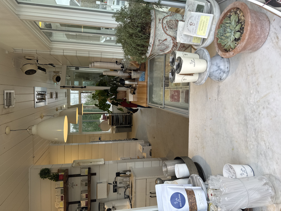 Inside a bright, sunlit shop, a variety of plants decorate the counter, including succulents in terracotta pots and a large herb plant in a distressed container. Coffee cups are stacked on a marble stand, and bags of granola and stirrers are neatly arranged. Through the windows, greenery is visible, suggesting a lush outdoor setting. The interior features white paneling, modern lighting, and a display case filled with colorful ice cream or gelato.