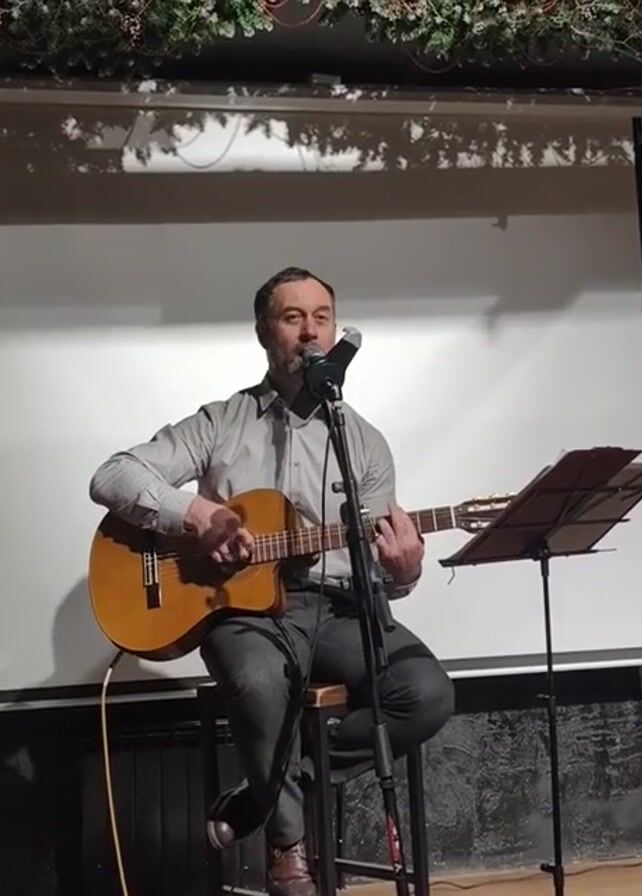 A middle-aged man with short dark hair and a beard, dressed in a gray button-down shirt and dark pants, sits on a stool and plays an acoustic guitar while singing into a microphone. He is positioned in front of a white screen, with a music stand to his right. A decorative garland hangs along the top of the screen. He appears to be performing in a dimly lit room, possibly a bar or restaurant.