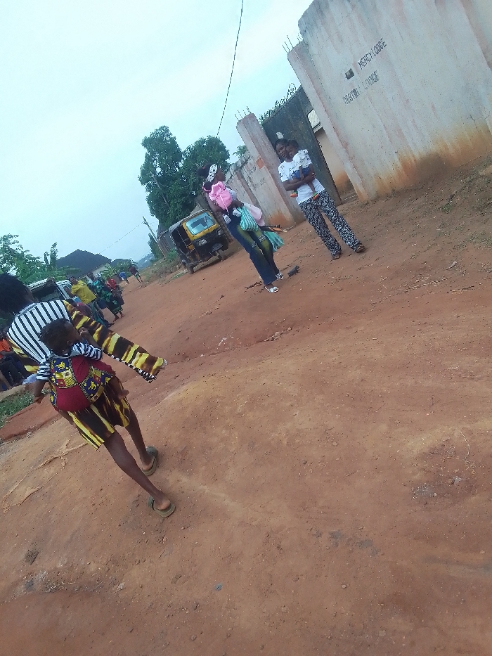 The image depicts a street scene in Ukwu-Abwa, Nigeria