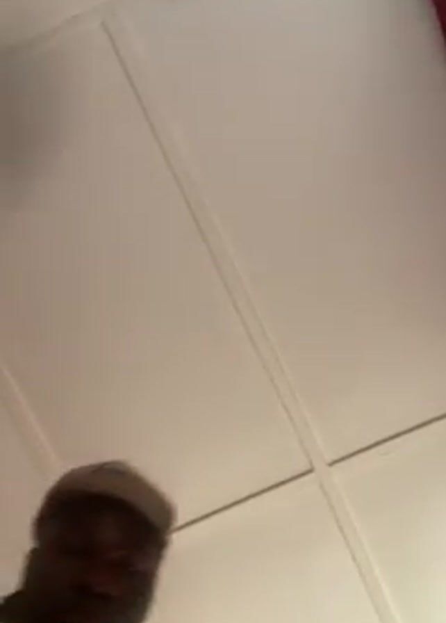 A man with dark skin, wearing a backwards baseball cap and a watch on his left wrist, appears shirtless in the video. He is viewed from a low angle, looking down at the camera. He brings his hand to his mouth and then to his chin. The background consists of a white paneled ceiling. A red curtain is visible in the upper right corner of the frame.
