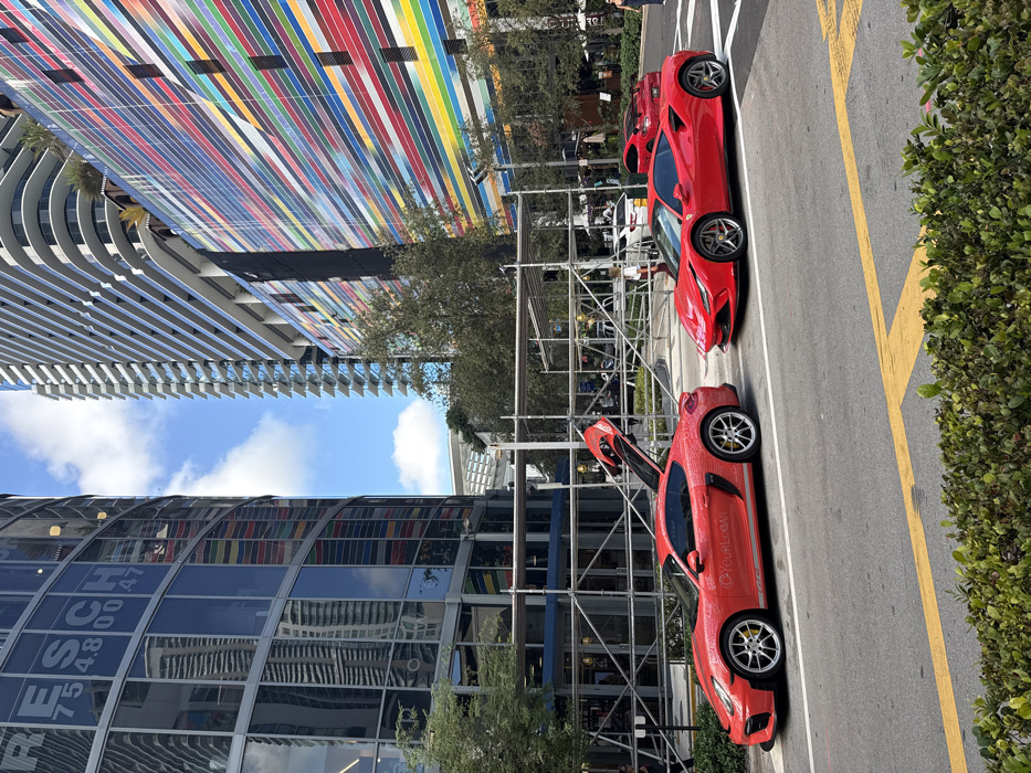 An urban street scene is depicted in the Miami Worldcenter district of Miami, Florida, United States, under clear daylight conditions with a blue, partially clouded sky. In the foreground, two red luxury sports cars are parked curbside, facing away from the viewer, on an asphalt street marked by a double yellow line. The vehicle on the left is a red Porsche Cayman GT4, featuring a subtle patterned wrap, "@YourLOGAN" text on its side, silver multi-spoke wheels with yellow brake calipers, and its front trunk (frunk) open. To its immediate right is a red Ferrari F8 Tributo, equipped with dark multi-spoke wheels. In the background, a third red sports car and a white SUV are partially visible further down the street behind a metal scaffolding structure. The scene is framed by modern high-rise buildings. On the left, a tall skyscraper with a dark glass facade, consistent with NEMA Miami, reflects the sky and a nearby colorful structure. Portions of a white sign displaying "RESC H" and numbers "75 4.8 00 47" are visible on its glass. On the right, a multi-story parking garage facade, belonging to PARAMOUNT Miami Worldcenter, exhibits a distinctive pattern of numerous horizontal, brightly colored stripes (red, orange, yellow, green, blue, black, white). Above this garage, a high-rise building with white balconies extends upwards. Metal scaffolding is erected along the sidewalk area between the street and the buildings. Scattered green trees and low-lying shrubs line the environment. Multiple indistinct pedestrians are observed moving in the background.