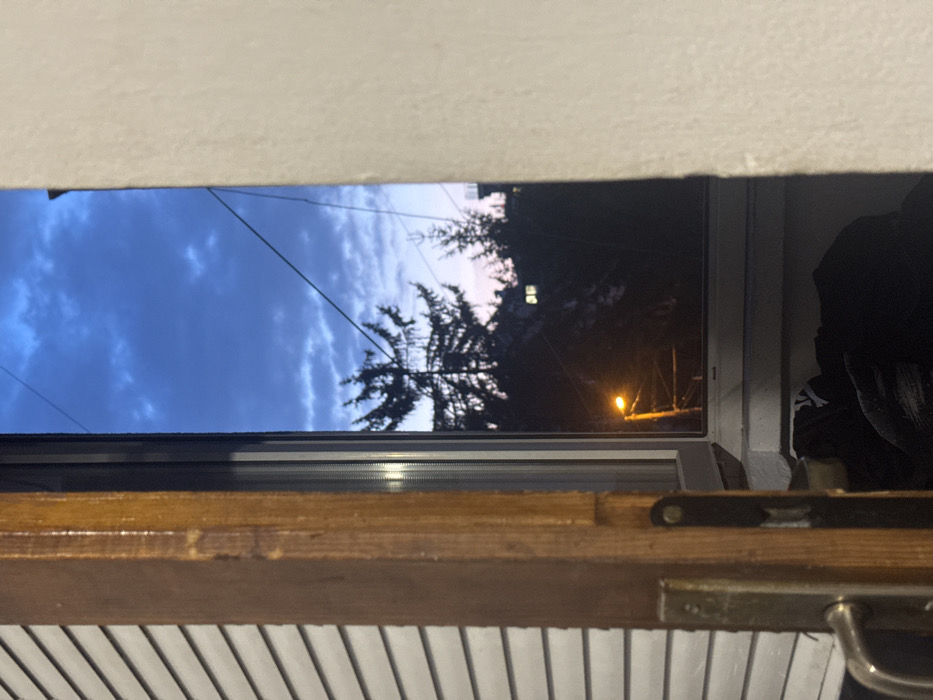 The image captures an exterior view through an open window at dusk in Sofia, Bulgaria