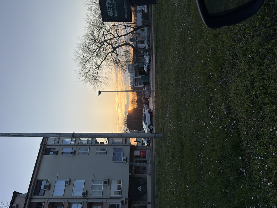 The image captures an urban streetscape in Burgas, Bulgaria, during sunset. The foreground features a patch of green grass dotted with small white and pink flowers, with a dark car mirror partially visible in the bottom right corner, indicating the photograph was taken from within a vehicle. A tall, grey pole stands vertically slightly left of the image center. To the left, a multi-story building with a light-colored facade is visible. It features numerous rectangular windows and multiple external air conditioning units. The ground floor houses commercial spaces, including one displaying an Adidas logo and another with a red "SALE -30%" sign. Beyond the grassy area, a street and a parking lot are present. A white SUV is prominently parked in the center-left, with other vehicles visible in the background parking area. A modern streetlight with a flat, rectangular lamp head stands to the right of the central pole. Further right, a deciduous tree with bare branches rises, silhouetted against the sky. Behind the tree and cars, lower-rise buildings are visible. On the far right, a large dark billboard displays "BETWAY" and "COMING SOON" in white text, with additional Bulgarian text below. The background shows a sunset with a distinct orange sun disc low on the horizon, partially obscured by distant trees and structures. The sky transitions from warm orange and yellow hues near the horizon to a clear light blue at the top, with some scattered clouds illuminated by the sun. No discernible individuals are performing specific actions in the scene.