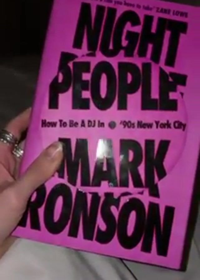 A hand holds a pink book titled "Night People: How To Be A DJ In '90s New York City" by Mark Ronson