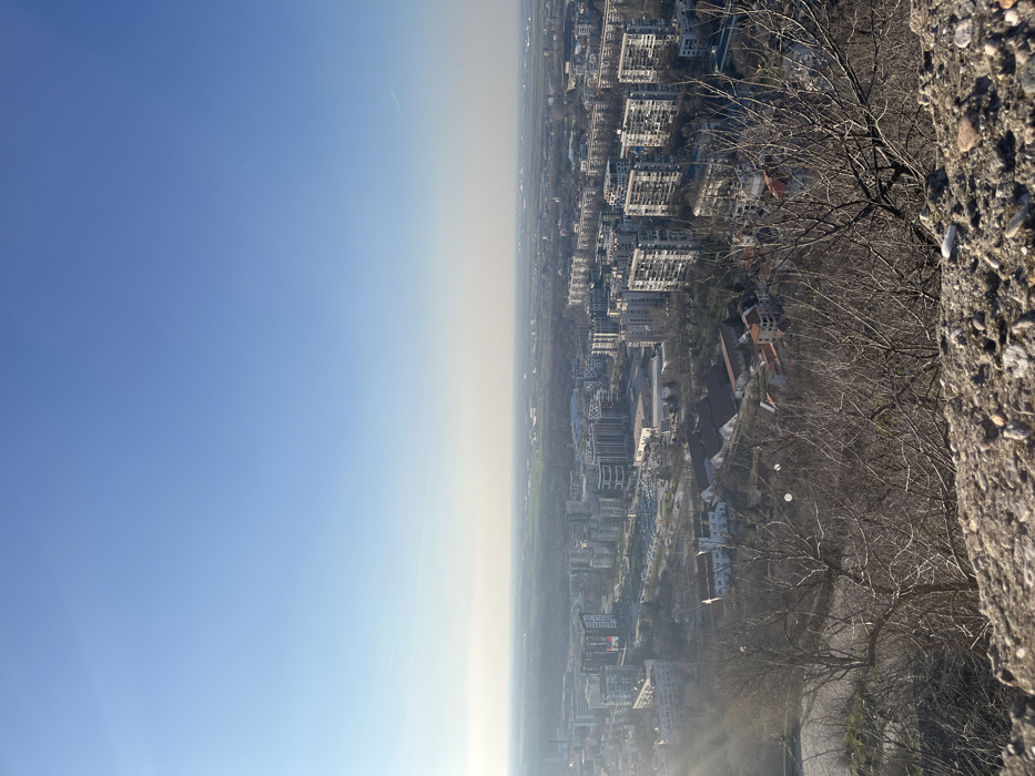 This image presents a panoramic, elevated view of the city of Plovdiv, Bulgaria, captured under clear daylight conditions. In the immediate foreground, a textured, rocky, and gravelly surface occupies the bottom portion of the frame, showing sparse, leafless deciduous trees and branches. A prominent sun flare originates from the lower-left corner, casting a bright streak across that section. The midground features a sprawling urban landscape, dominated by numerous multi-story buildings. These structures include apartment blocks with repetitive window patterns and commercial buildings, many displaying light-colored facades. Interspersed among these modern developments are areas with smaller, older buildings, some identifiable by their traditional red-tiled roofs. A large, irregularly shaped parking lot filled with vehicles is visible centrally within the city layout. Further into the background, the urban density gradually dissipates, transitioning into a vast, flat plain with what appears to be a mix of distant urban expansion and agricultural fields, all receding into a significant atmospheric haze along the horizon. The sky is uniformly clear and pale blue, occupying approximately the upper third of the image. A single, faint white contrail is visible in the upper-right quadrant. No individuals or specific interactions are discernible within the frame.