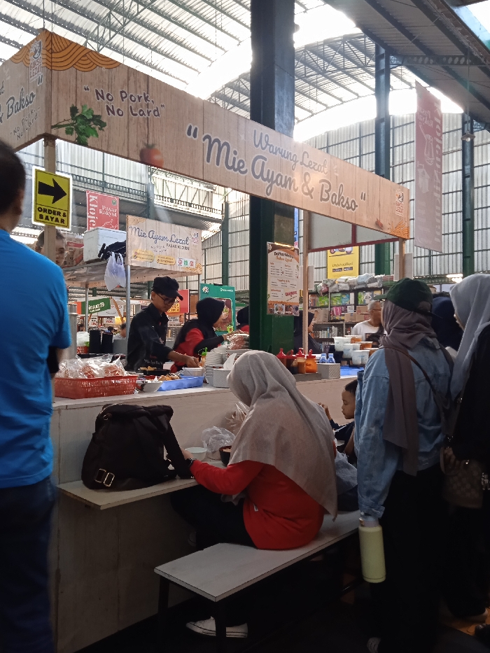 bustling food stall called "Warung Lezat Mie Ayam & Bakso," indicating that it specializes in chicken noodles and meatball soup. A sign assures customers that the food contains "No Pork, No Lard." Customers are lining up to order, and some are seated at a counter eating. Another sign directs customers to order and pay at the counter. The market appears to be located indoors in a building with a high, exposed metal roof.