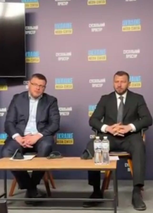 two men sitting in front of a backdrop with “Ukraine Media Center” printed repeatedly