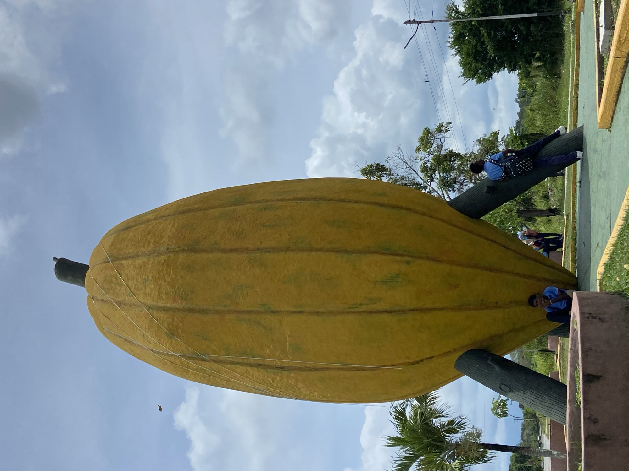 - "The image depicts a large, yellow, oval-shaped sculpture resembling a cacao pod, centrally located in an outdoor public space in San José de Barlovento, Venezuela, under an overcast sky with scattered white and grey clouds" by FM-faLbl2, licensed under CC BY 4.0