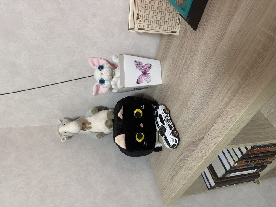 A plush grey horse, a black cat plush with yellow crescent moon eyes, and a white toy car sit on a surface. A white box with a butterfly design contains a stuffed animal with large blue eyes and pink ears. A game with numbered squares rests on the surface near a shelf with a stack of books. The surface appears to be a table or shelf with a light wood grain.