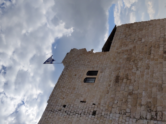 The image displays an upward view of a large, light-colored stone wall, part of the Antipatris Fortress (Qal'at Ras al-Ain) located in Rosh HaAyin, Israel. The wall is constructed from numerous cut stone blocks, exhibiting signs of age and wear. Approximately midway up the visible structure, two narrow, arched windows with dark frames or grates are set into the stone. At the highest point of the visible ruin, an Israeli flag, featuring blue stripes and a blue Star of David on a white field, is mounted on a pole and appears to be gently waving against a backdrop of heavily clouded sky. The clouds are predominantly white and grey, with some patches of blue sky visible. No individuals, specific actions, or interactions are present in the scene.