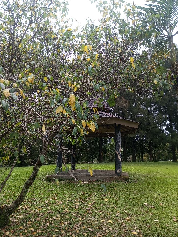 A tree with sparse green and yellow leaves stands in front of a gazebo-like structure. The structure has a dark tiled roof and dark columns. A grassy lawn stretches out in front of the tree and structure, with scattered fallen leaves. In the background, other trees and a palm tree are visible against a gray sky.