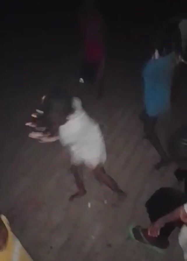 group of children, possibly in Africa, dancing barefoot on a sandy surface at night. The scene is dimly lit, making it difficult to discern fine details. Several of the children are wearing shorts or t-shirts. The ground appears to be sandy, with some small debris. The children seem to be enjoying themselves, dancing to music not heard in the video.