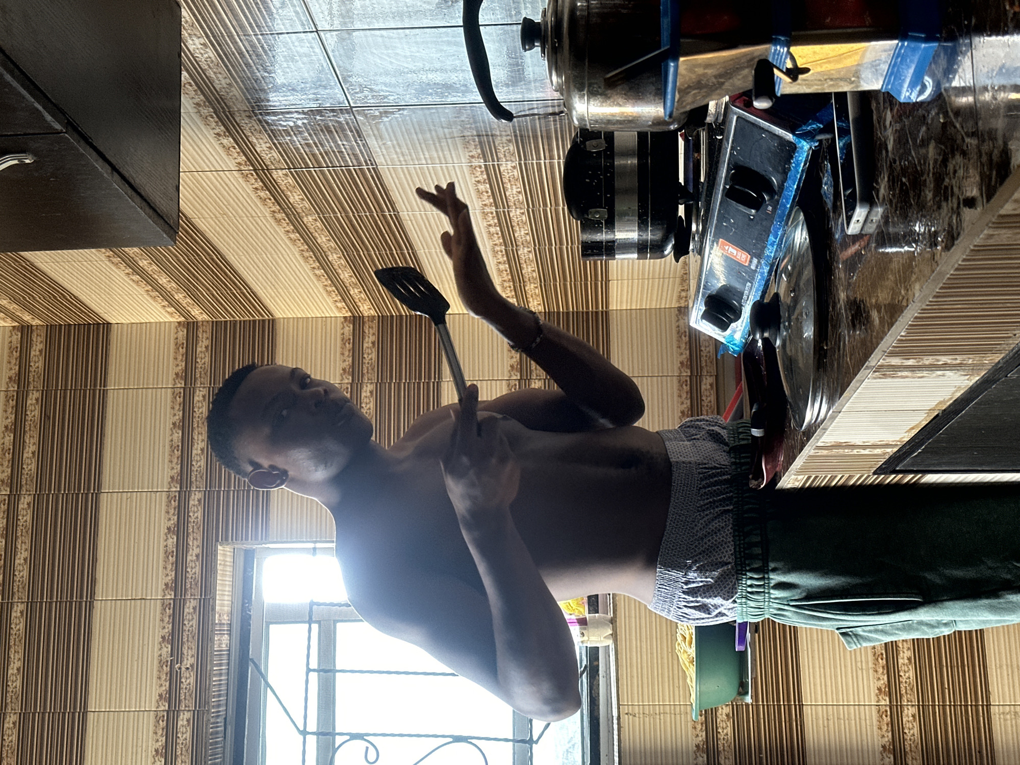 A shirtless man stands in a kitchen in Obinze, Nigeria, holding a spatula