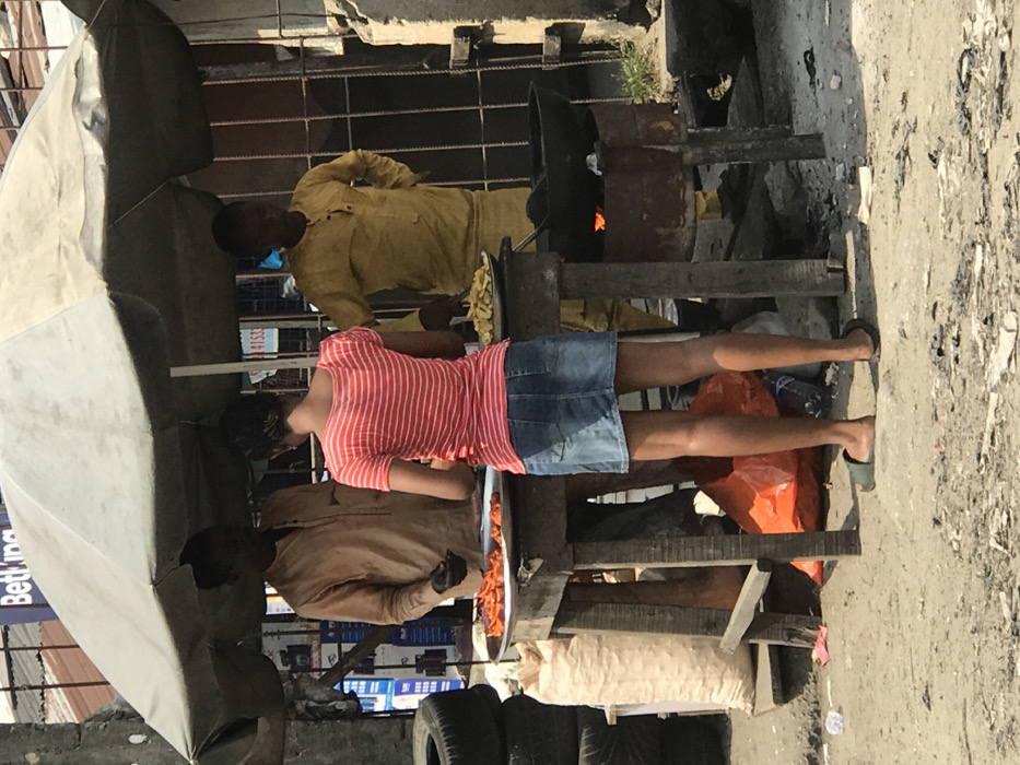 The image depicts an outdoor street food stall operating on an unpaved urban street in Unknown, Unknown