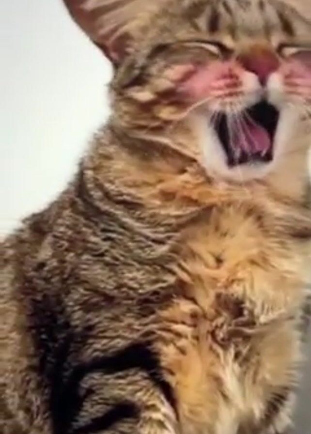 A close-up shot shows a brown tabby cat, facing forward and slightly to the right. The cat has a pink tint to its nose and cheeks. Its ears are perked up and it's wearing a disgruntled expression. The cat opens its mouth in a wide yawn, revealing its teeth and tongue. Then the cat closes its mouth and looks downward with an even more disgruntled expression. A voiceover says, "Are you a grumpy little gremlin? Are you a little grump-er wearing your…" before the video ends. The background is a plain white wall.
