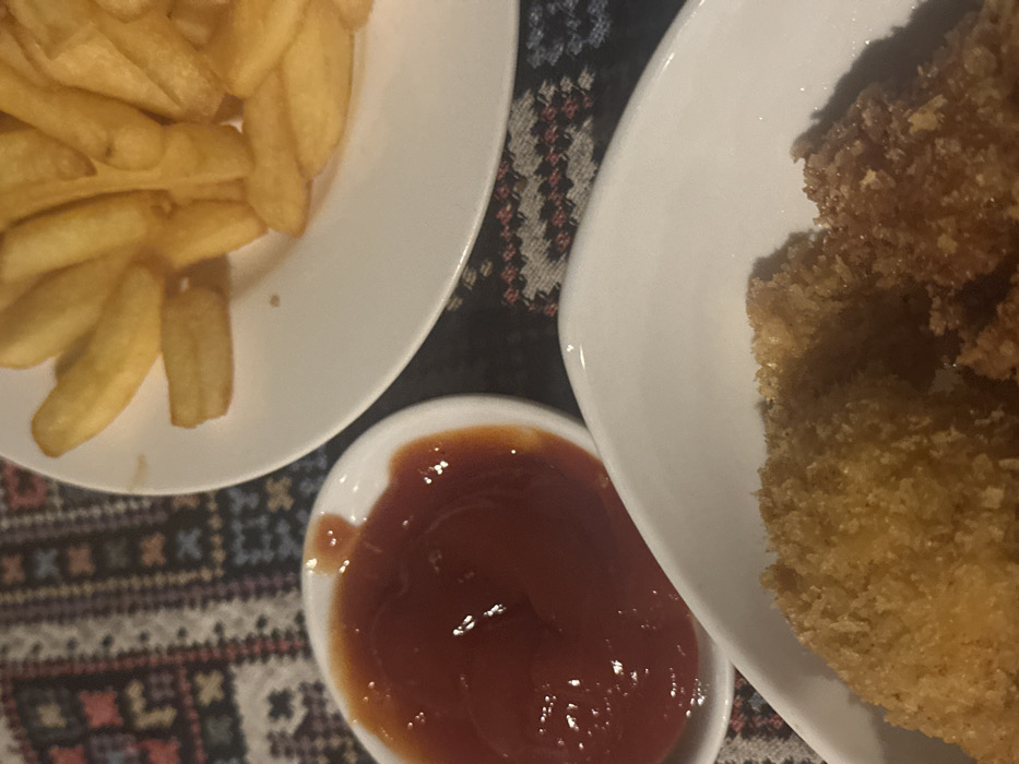 The image presents an overhead view of a meal served on a patterned surface in Mai Chau, Vietnam. Three white ceramic dishes are visible. In the upper right, a plate is filled with numerous golden-brown french fries. To the middle left, a small round bowl holds a quantity of viscous, reddish-brown ketchup. Partially visible in the lower foreground is a third dish, likely rectangular or boat-shaped, containing breaded and fried food items with a coarse, golden-brown coating. All dishes are situated on a dark textile featuring a geometric woven pattern with elements of dark blue, red, brown, and off-white. No people are present.
