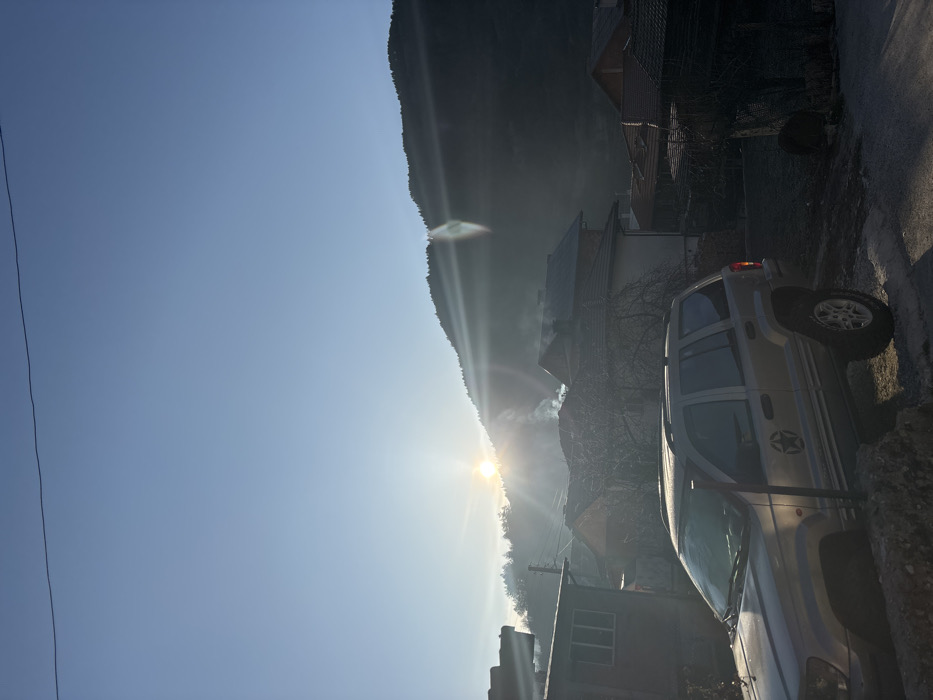 The scene depicts a clear, sunny winter morning or late afternoon in the mountainous settlement of Grohotno, Bulgaria. A light-colored, possibly tan or gold, four-door SUV (identified as a Jeep Grand Cherokee, likely a WJ generation) is parked prominently in the lower-left foreground on an uneven, possibly frosted dirt or gravel surface. A dark, five-pointed star decal is affixed to the driver's side rear door, and a long, dark-colored shovel-like object is vertically mounted near the front driver's side door. In the midground, several residential houses with varying architectural styles and tiled roofs are visible. Smoke rises from multiple chimneys, indicating active heating. Bare deciduous trees and dormant vegetation are scattered among the structures. A large pile of dark, unidentified material is located behind the SUV, between the houses. The background features a steep, dark green, forested mountain range, behind which the sun is positioned low in the sky, emitting bright rays and producing significant lens flare. The sky above is clear blue, with a thin, dark line, likely a power or communication line, stretching horizontally across the upper frame. No individuals are visible in the image.