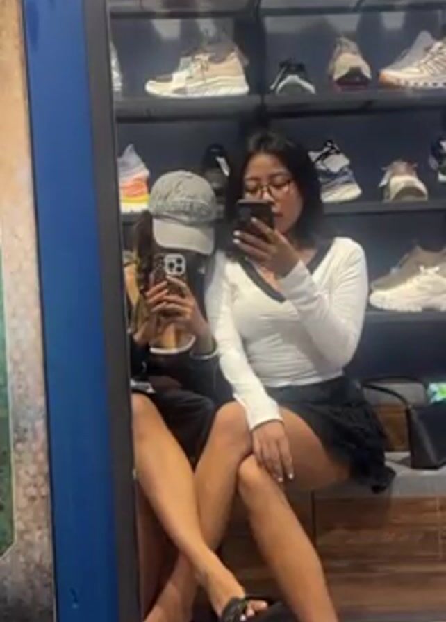 Two young women are seated side-by-side, taking mirror selfies inside a shoe store. One woman is wearing a white long-sleeve top with black trim, a black skirt, and glasses, while the other is wearing a black top and a grey baseball cap. Both are holding smartphones and looking at their screens. Shelves filled with sneakers are visible in the background.