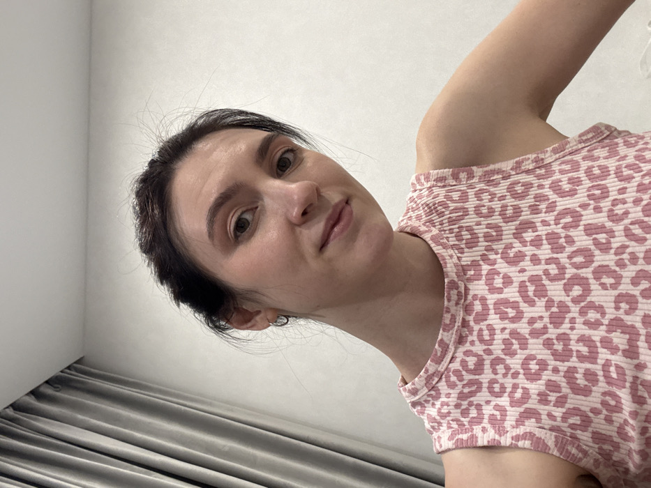 A woman tilts her head, gazing at the camera. She has dark hair pulled back, fair skin, and a subtle smile. Her pink and white leopard-print top is ribbed. The background consists of a white wall and gray curtains, slightly wrinkled. The overall composition suggests a casual, close-up shot.